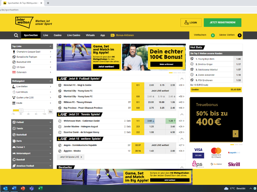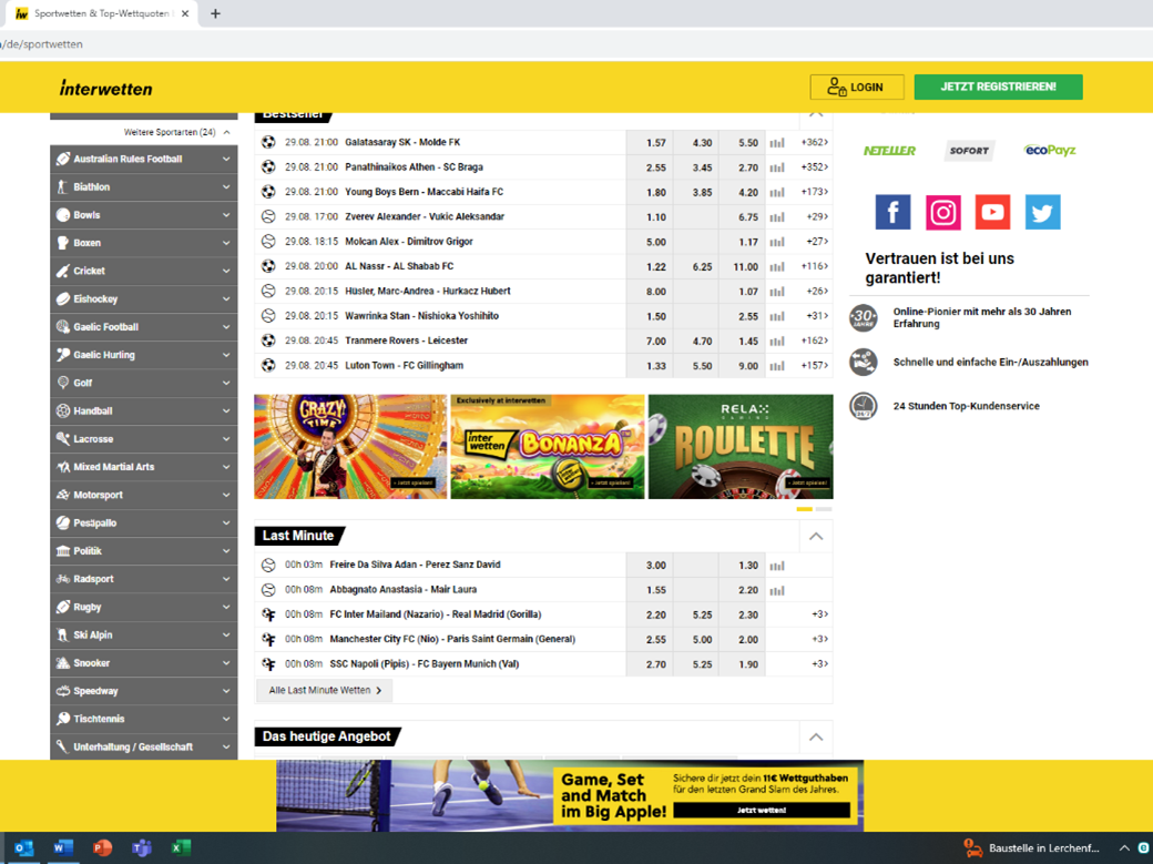 Auf der Startseite ist man automatisch im Menüpunkt „Sportwetten“ und sieht alles rund um diese (Sportarten, Live-Wetten, Bestseller, Last Minute…).